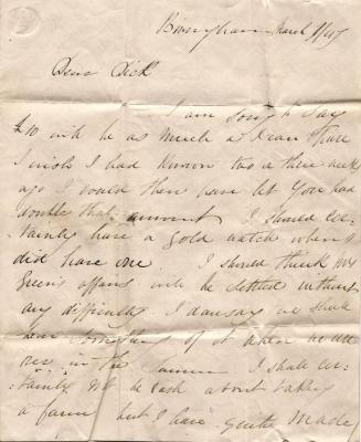 [[The letter is dated 7 March 1847, and bears an imperforate penny red adhesive postage stamp. Although the postmark is incomplete, the letter appears to have been posted in Birmingham on that day. The top of the missing day numeral is a straight line [[7] and not a curve [[8].