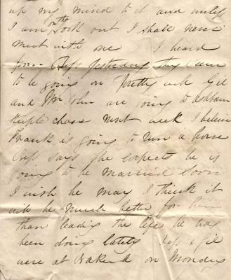 up my mind to it and unless I am on the look out I shall never meet with one I heard from Bess yesterday they seem to be going on pretty well Gil and Mr John are going to Ashbourn steeple chase next week I believe Frank is going to run a horse Bess says she expects he is going to be married soon I wish he may I think it will be much be much better for him than leading the life he has been doing lately Bess & Gil were at Bakewell on Monday
